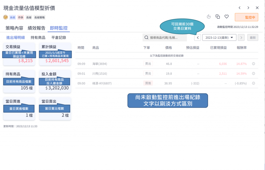 在「持有商品」這個分頁中,主要展示的是目前按照策略已經進場但還沒有賣出的標的。如果是在啟動監控之前就已經進場的標的,系統會用刷淡的文字來顯示,這樣一來,你就能一眼看出哪些是最近進場的標的,而哪些則是之前就持有的。