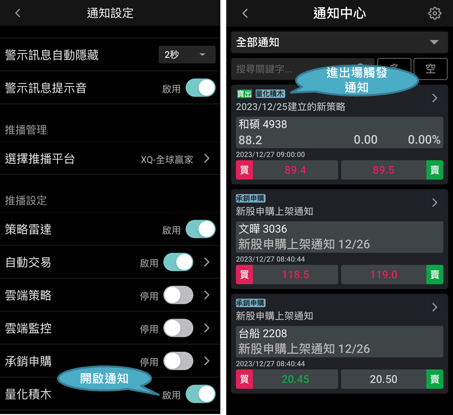 另外手機APP也可以看到通知喔!不過記得要更新到最新版本的XQ全球贏家版本,並開啟量化積木的通知。