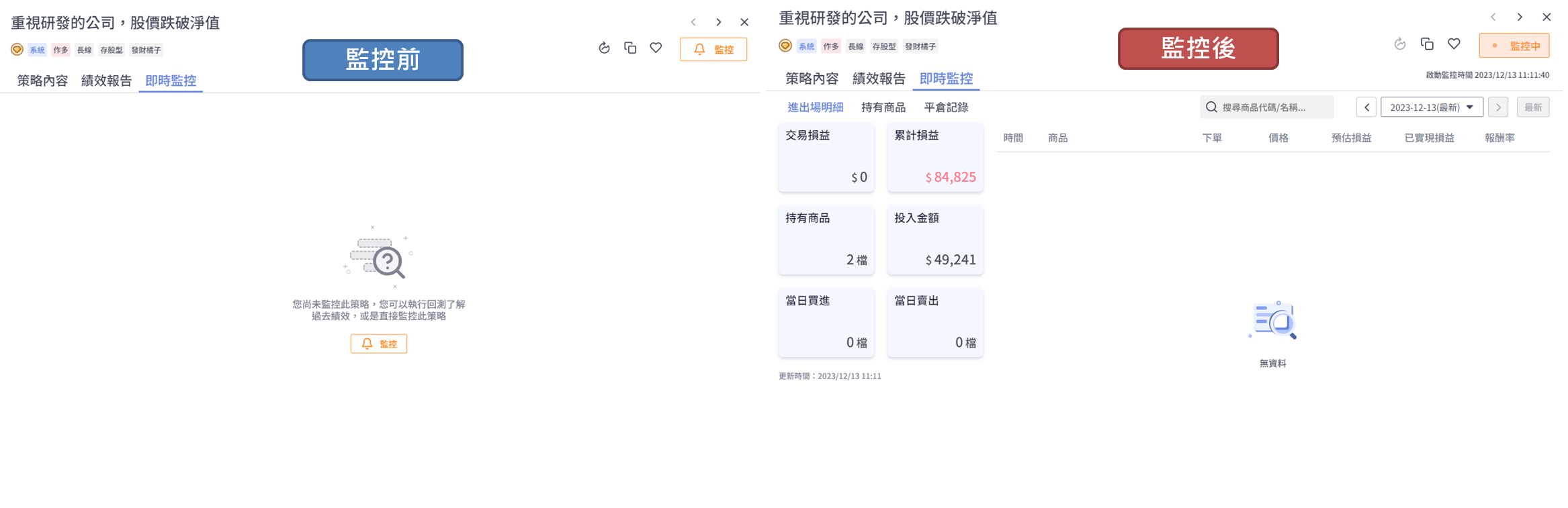 當我們已經自訂完自己的策略後,可以到「我的自訂策略」內看到所有的自訂策略,這時候就可以開啟監控,開啟監控後,若有觸發標的會在盤中或是盤前通知。 當要看盤中觸發訊號時,可以在即時總覽內的「進出場明細」來查看,如果策略只有盤後條件且有觸發時就會顯示在「盤前通知」。