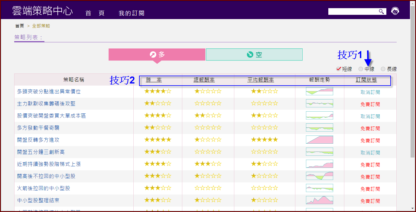 雲端策略中心首頁,將策略區分為多、空兩種,在多、空分類下,依照策略屬性不同,策略共分為短線、中線、長線三種,讓使用者可以依照自己的投資習性,去尋找對應的相關策略。