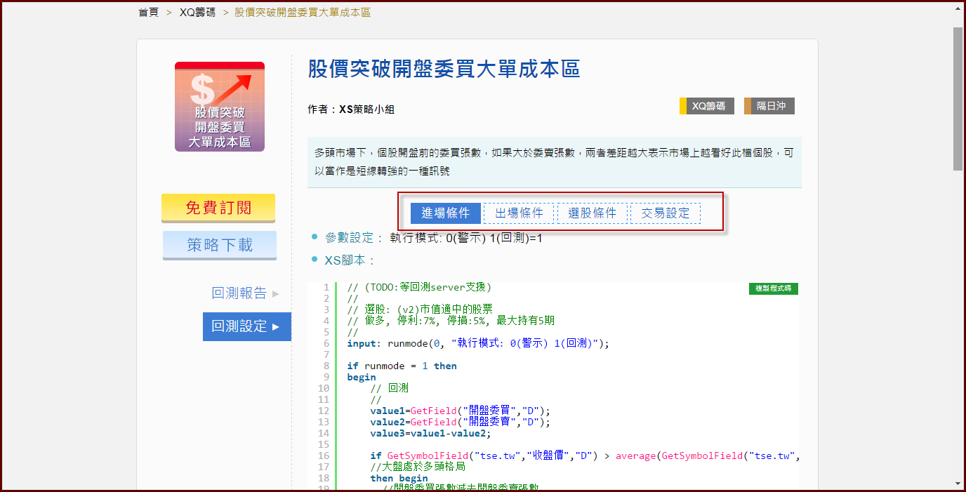 以上為新的雲端策略中心的新貌,除了以上的更新外,這次XQ小組特別將所有的策略重新改寫過,以更嚴謹的角度做出發,提供更為貼近策略想法的腳本,配合新增回測的相關資訊,希望未來在使用策略中心時能夠更便利。