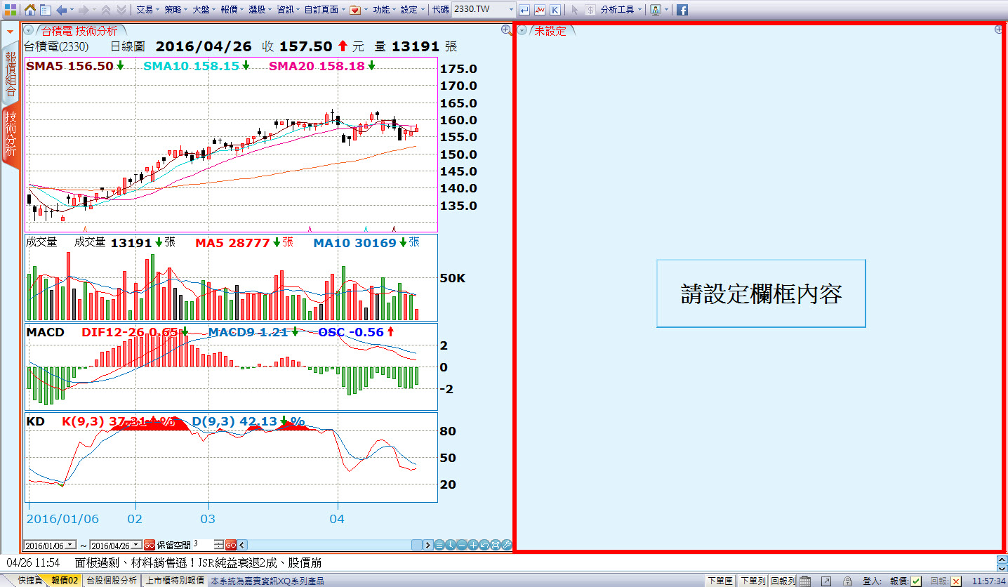 (3) 已完成「商品一致」設定,請試著點選報價組合中的「台積電」,並確認「報價組合」及「技術分析」頁籤內容均會切換為「台積電」。