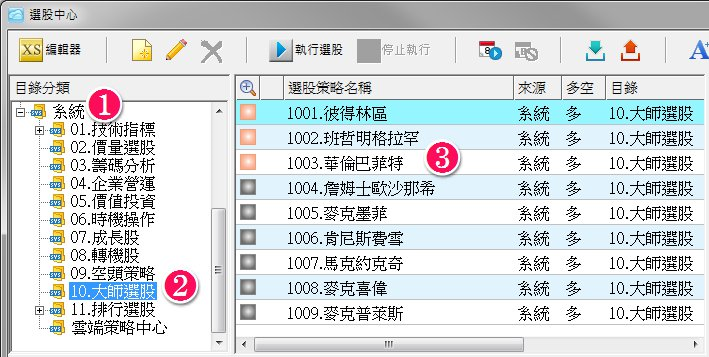 在目錄區,可以依標籤或目錄來切換清單區內的選股策略清單。 點選「系統→10.大師選股」,右方清單區會列出多位國際大師的選股策略。