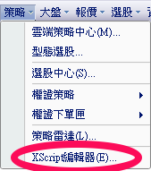 接下來,回到XQ、打開XScript編輯器。 從主選單的 策略→XScript編輯器