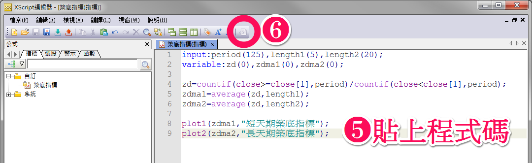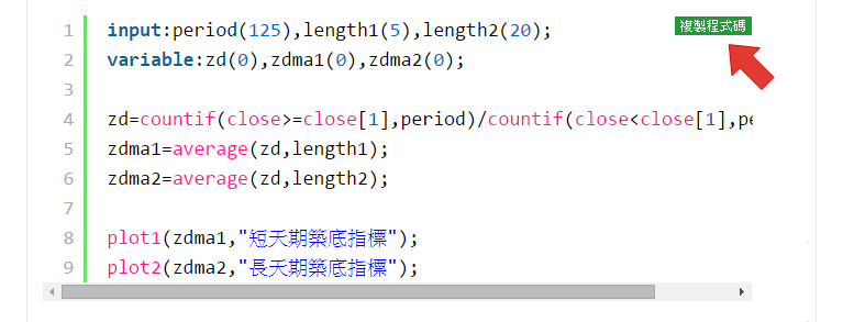 築底指標做範例。 打開網頁之後,可以看到圖文並茂的說明。每篇可都是專家們的心血,值得你再三研究。不過我們今天是來教怎麼樣把指標放到XQ裡,所以,請往下找到程式碼的位置。 在每篇文章中,程式碼都是以獨立區塊顯示的,點擊右上角的標記程式碼之後,系統會自動幫你選取要複製的程式碼。請利用右鍵選單將程式碼複製一份下來。
