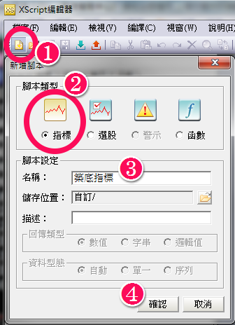 這次的範例是「築底換標」,所以接下來我們來新增一個指標腳本 1. 點擊工具列上的【新增】