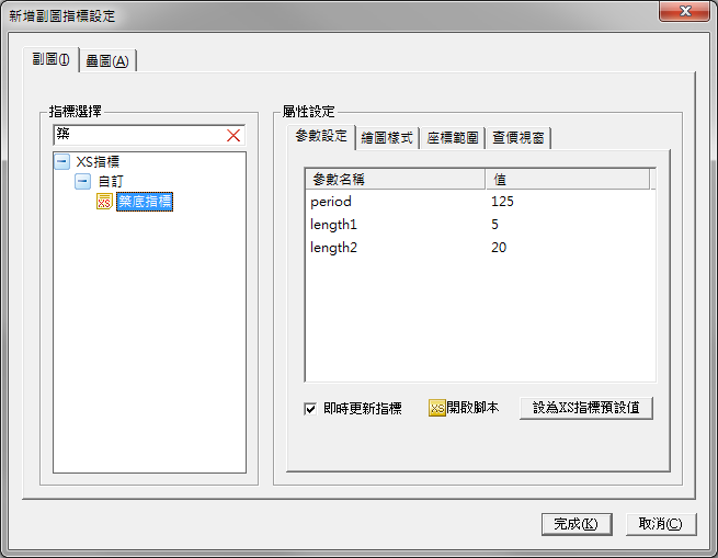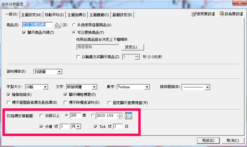- 分鐘、Tick:預設勾選。勾選此項,則XS指標計算範圍,依據設定期間繪圖;不勾選此項,系統會以所有已下載資料進行運算,可能會有系統延滯的現象。