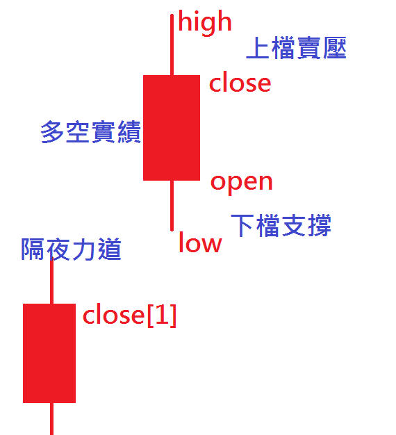 我們經常用收盤價作移動平均線,然後尋找不同天期的均線,出現黃金交叉時買進,出現死亡交叉時賣出。 之所以這麼做,是因為我們覺得收盤價是當天多空爭戰的最後結果,所以拿收盤價的移動平均代表了一段時間多空爭戰的軌跡。 但如果我們細看每根K棒,我們其實除了收盤價之外,還有當天的開盤價,最高價,最低價,我們可以運用這些價位,更精確的勾勒出當天多空爭鬥的力道。 就像上面的這張圖 我們可以 1.把每天最高價到收盤價的距離,視為當天上檔的賣壓 2.把每天最低價到收盤價的距離,視為下檔的支撐 3.把每天開盤價到收盤價之間的距離,視為多方或空方的戰績 4.把前一天收盤價到今天開盤價的距離,視為前一日收盤後多空消息消化後的結果 當我們把這種多空力道都考慮進去之後,我們可以計算一段時間這些力道的總和,這樣的總和,會比收盤價更能表現出這檔商品多空力道的消張。 根據這樣的想法,我寫了一個指標,這個指標的寫法如下:
