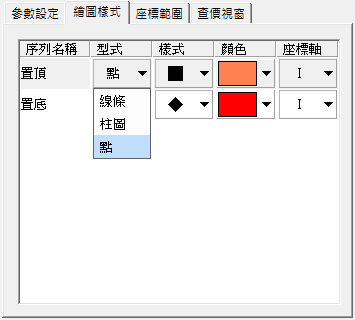 到這邊之前的操作方式都與前一篇相同,接下來小編要開始講解不同之處 在上一篇文章中,訊號需要乘上一定的數字,才有辦法在K棒的上下方顯示, 但新版2.30的XQ新增了4個功能,分別是「置頂、置底、最高、最低」,這4個方法只有支援「點」的繪圖模式, 在繪圖設定選擇「點」後,在座標軸設定會多「置頂、置底、最高、最低」的選項。