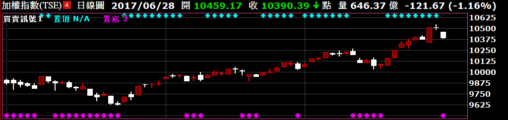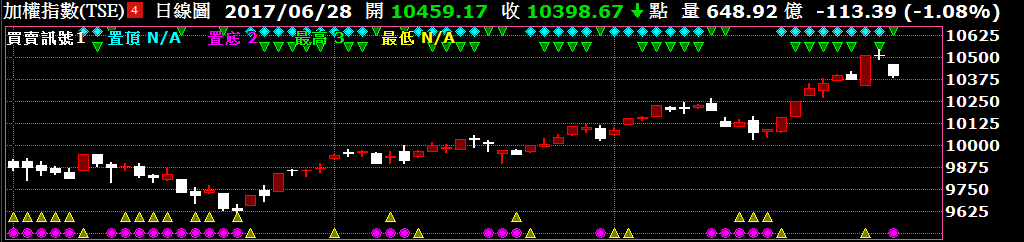 看完了置頂、置底的介紹,再來介紹的是最高跟最低。 最高跟最低主要是圖型會在K棒的上下方做圖型繪製。