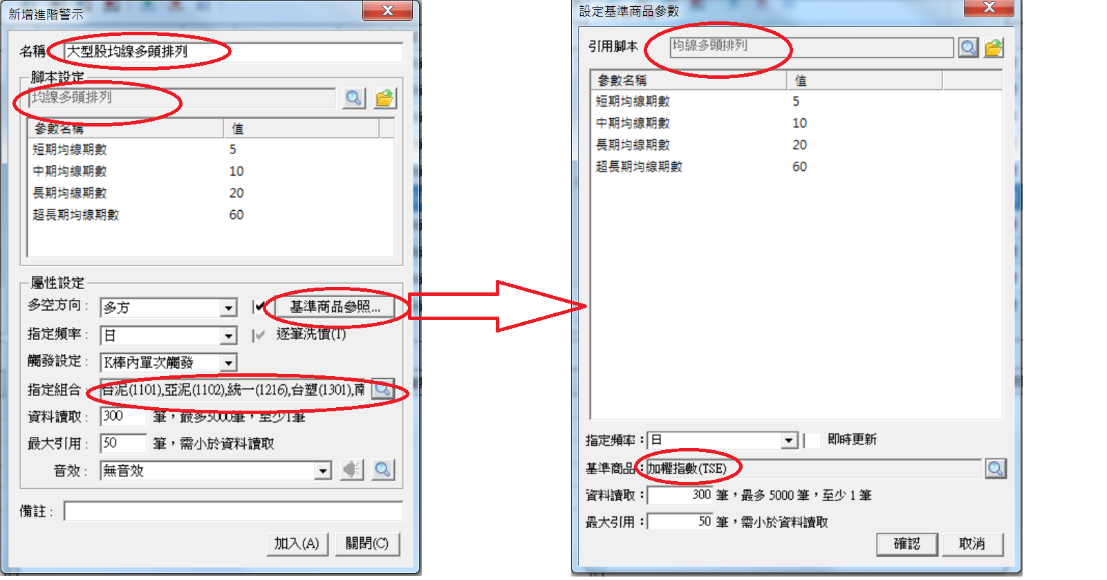 有很多市場先進都這樣子告訴我們,做股票要順勢,一定要根據大盤的多空來判斷該用哪種方式進出。同樣的,策略雷達內這麼多個腳本,有一些偏短線多方的腳本也一定要在盤勢上揚的情形底下使用,勝算才會高。那該怎麼讓策略雷達只有在盤勢OK的時候,才發訊號給我呢? 底下就跟大家介紹一個進階的功能:基準商品參照。 這個功能可以讓你在指數均線多頭排列時,才通知你大型股也均線多頭排列的股票,這個功能可以讓你在面板股資金回流時,再通知你量能暴增的面板股,這個功能可以讓你在台積電創新高之後,一旦聯電創新高時通知你。 怎麼做呢? 當您在設定策略雷達時,中右方有個按鍵叫基準商品參照(參考附圖),按下去時,會跳出一個視窗,長的跟設定策略雷達的視窗很像,從這個視窗內可以引用任何一個腳本,可以調整參數,指定頻率,更重要的,他可以讓你選擇一個商品,這個商品就是基準商品。