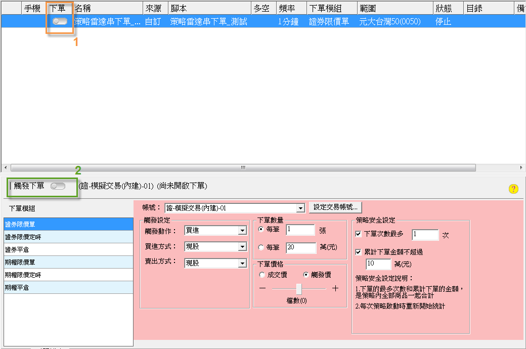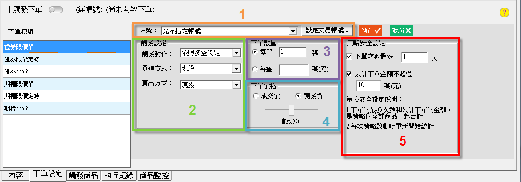 - 5. 策略安全設定:設定「下單總次數」,以及「下單總金額」的安全設定,確保下單時的風險控管