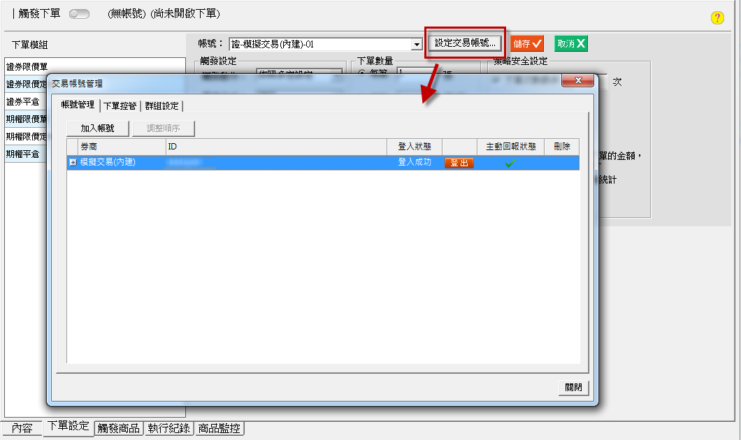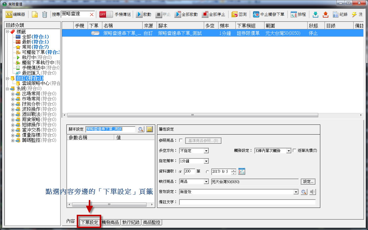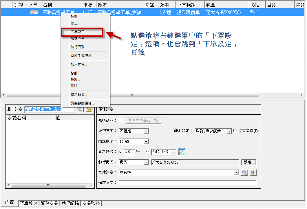 用戶們也可以利用自訂策略的右鍵選單,點選裡面的「下單設定」項目,系統也一樣會跳到「下單設定」功能頁籤。