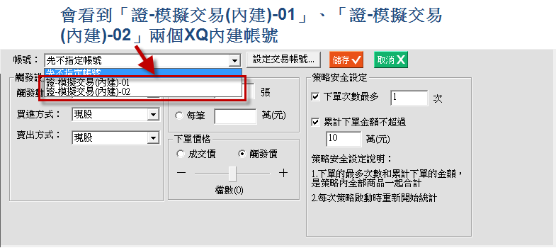 不過想必用戶們跟小編一樣是一個謹慎小心的使用者,在使用策略雷達下單功能前,一定想先確認訊號觸發後所帶的下單委託,是不是和「下單參數」中所設定的一樣,以及這個策略是否有達到心目中的預期成效,這時就可以使用「XQ模擬交易帳號」,在使用XQ模擬交易帳號下,系統會將策略觸發時的下單委託給傳送到模擬交易後台,來模擬真實的交易狀況,這樣用戶就可以確認委託單的狀況,以及策略的成效。 而要如何使用「XQ模擬交易帳號」呢?很簡單,每個XQ用戶都會內建兩個模擬交易帳號,不用做任何設定,只要登入XQ系統後就會自動登入,所以在「1. 交易帳號設定」下拉選單中,自動就會產生這兩組帳號,分別為「證-模擬交易(內建)-01」&「證-模擬交易(內建)-02」用戶們可以針對不同的策略來使用不同的帳號,這樣更可以比較出策略的成效‧
