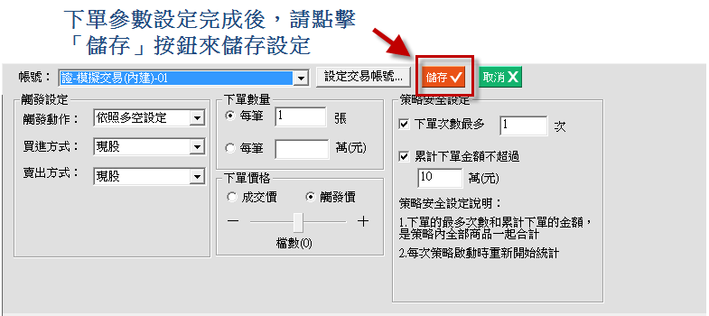 當下單參數設定完成後,用戶們只要按下「儲存」按鈕,系統就會將設定儲存完成,注意!在完成設定前,請再次確認「5. 策略安全設定」是否有填入符合用戶所能夠接受的下單總次數&下單總金額,以確保做好下單的風險控管。