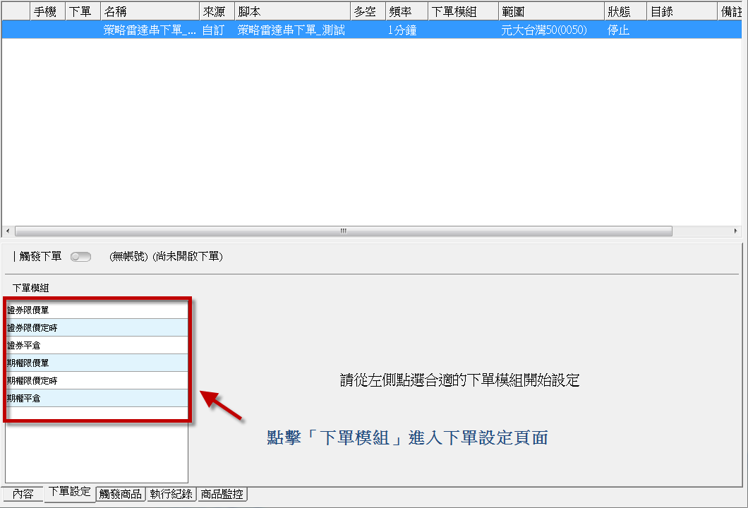 如果所選定的策略還未完成下單設定,在進入到「下單設定」介面時,系統會先顯示提示文字,說明由左側點選合適的下單模組,我們可以點擊左側的「下單模組」來開始設定策略的觸發下單方式。