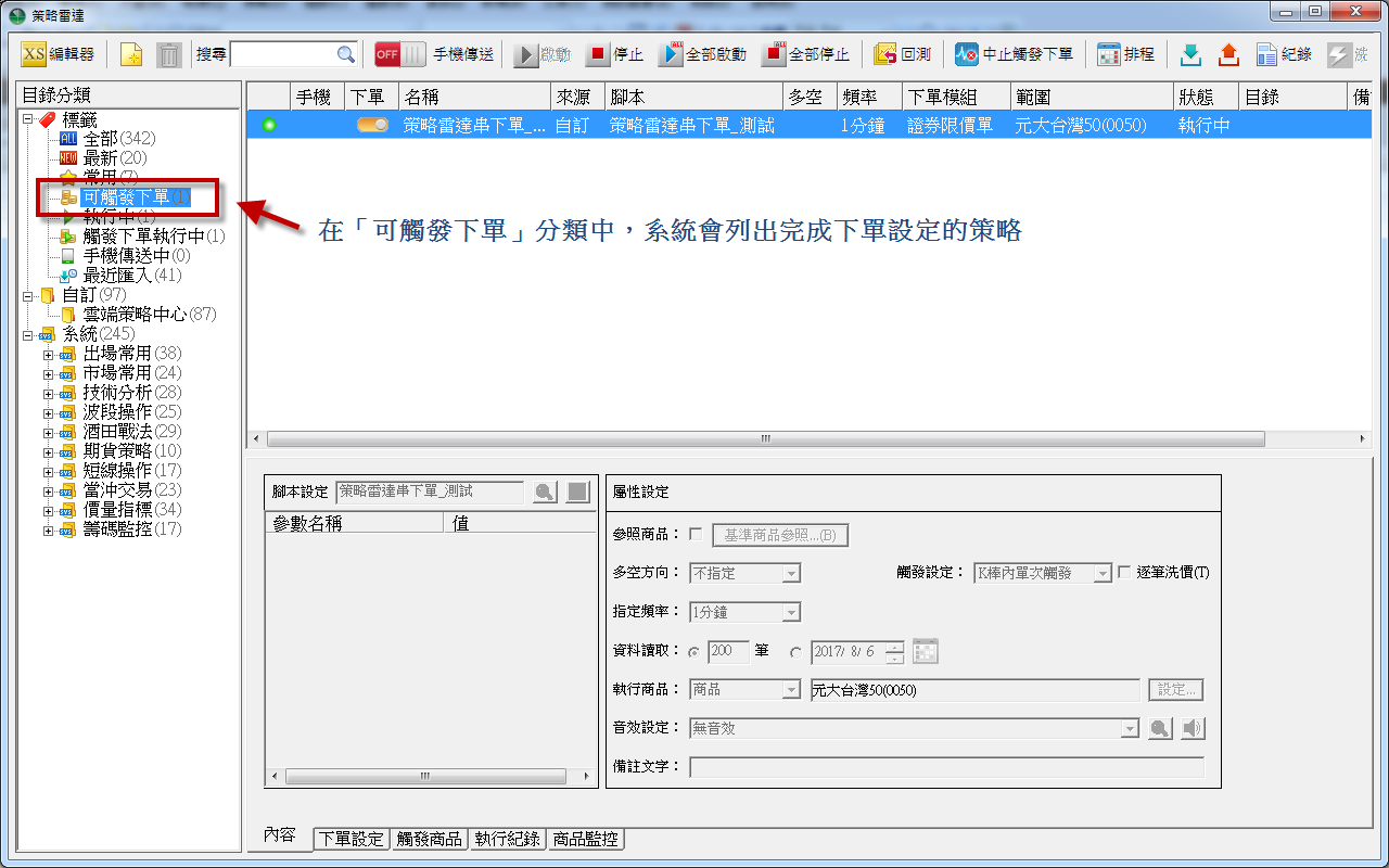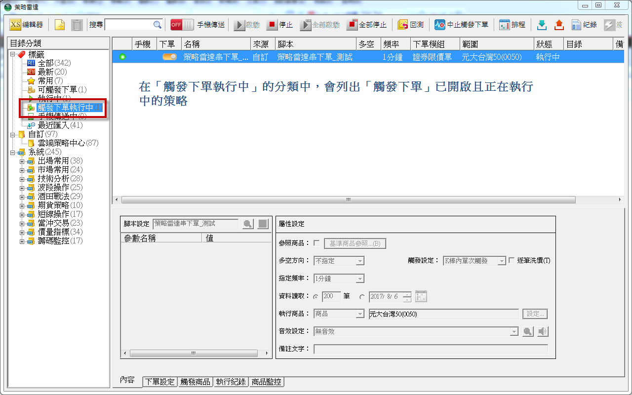 在「策略雷達」左邊分類區中,有兩個分類是和觸發下單的策略有相關,分別是「可觸發下單」&「觸發下單執行中」這兩個分類。 「可觸發下單」分類中,會列出已經設定好下單設定的策略,顧名思義,「下單設定」如果沒完成的策略,是不會在這個分類中出現,讓用戶們可以方便管理。