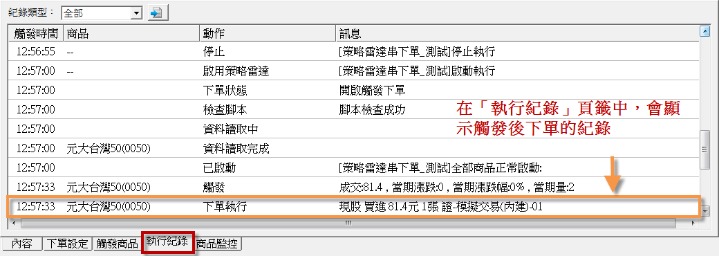 當我們為策略完成下單設定後,必須開啟「觸發下單」開關,這樣當策略在執行時,系統才會在有商品觸發的同時送出委託,用戶們可以在任何時候調整這個開關(包含策略在執行時),如果在策略執行時關閉「觸發下單」,系統在下次觸發出現時,就不會送出委託。 有兩種方式可以開啟「觸發下單」。當我們開啟「觸發下單」開關後,我們可以開始執行這個策略,當有商品觸發後,系統就會執行下單的動作,用戶們可以在這個策略的「執行紀錄」頁籤中(底下第四個功能頁籤),查詢到觸發下單的紀錄。