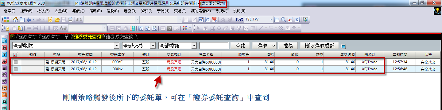 而系統所送出的委託單,用戶們可以至主選單「交易」底下的「證券委託查詢」頁面,確認剛剛所下的委託單狀況。