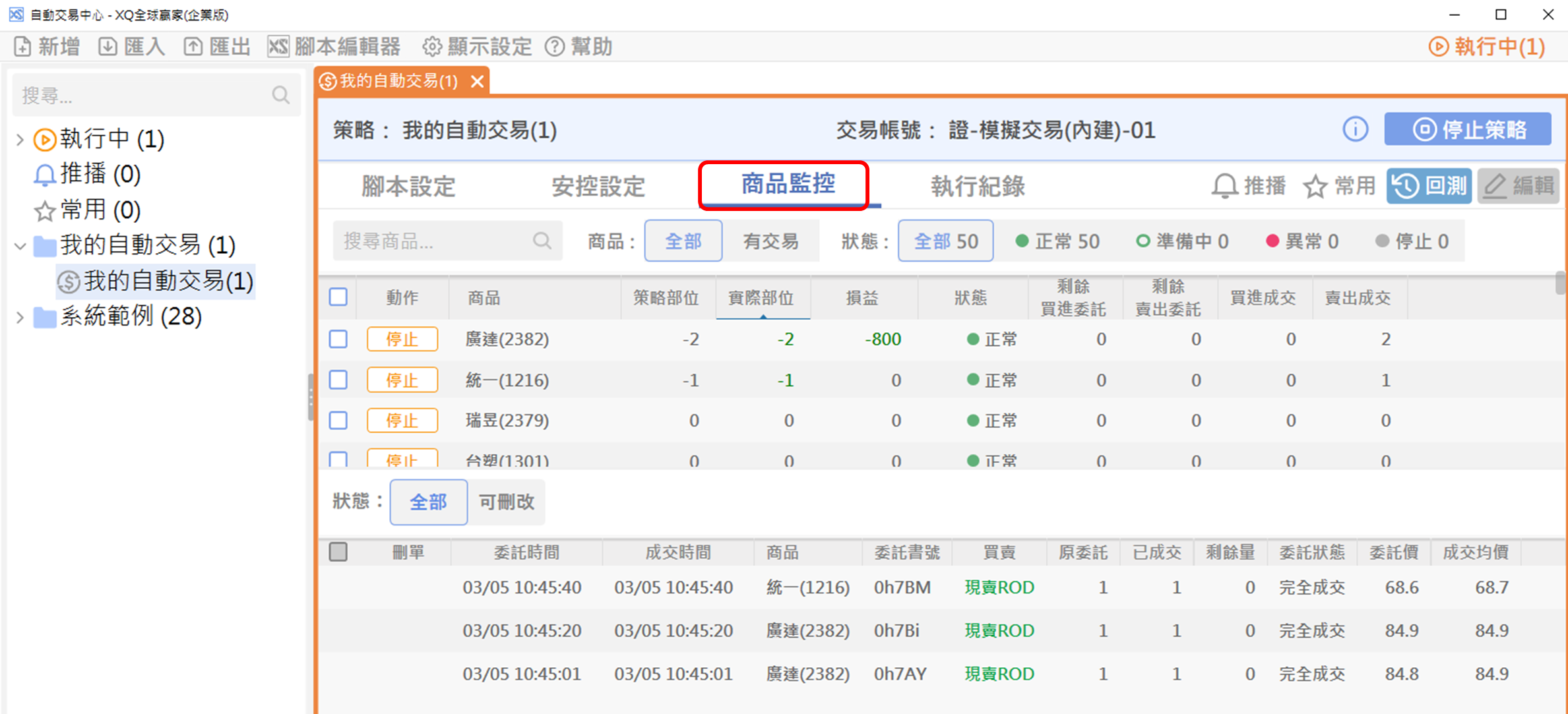 自動交易策略啟動之後,可以在商品監控區內看到每個商品的執行情形,以及執行過程內所傳送的委託單 在這個畫面的上半部,可以看到每個商品的以下欄位:- 策略部位:顯示商品目前的Position數值