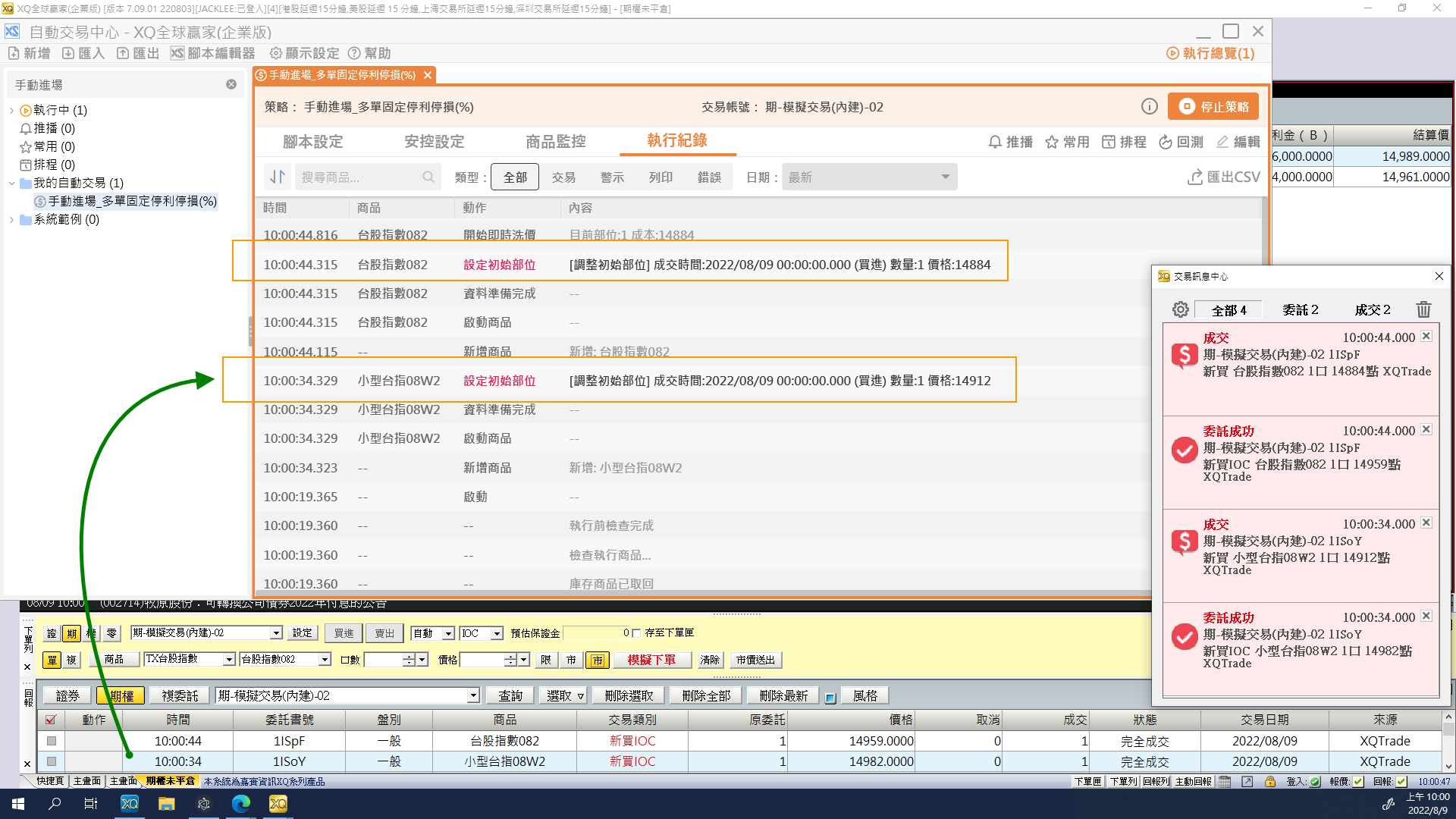 當我們這樣子設定之後,策略啟動時會自動抓取庫存內的商品,依照庫存部位開始執行,同時也會監控庫存的變化,當有新的商品加入庫存時,商品就會自動執行。 接下來策略啟動之後,如果我們從XQ下單,當委託成交時,而且成交的商品是之前庫存內沒有的商品的話,自動交易策略就會自動抓取成交的部位以及成交均價,同時開始執行這個商品。之後當這個商品的價格觸及停損/停利的價格時,自動交易策略就會自動執行出場的動作。