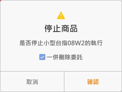 此時會跳出「停止商品」視窗與「一併刪除委託」的核取方塊,這裡的委託是指由該策略送單出去的委託。選項設定完後,再按下確認,該單一商品就會停止執行。