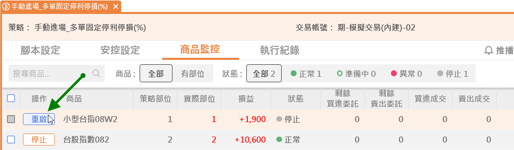 到這裡為止,我們複習一遍調整執行商品/商品部位的各種方式:- 如果策略的執行商品是帳號的庫存商品的話,可以透過「庫存異動時自動加入執行」來確保自動交易策略會執行庫存內的所有商品。