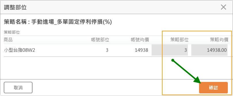 接下來點擊「調整商品部位」此時會出現「調整部位」視窗。你可以在這裡填入策略部位與策略均價,按下確定後,這檔商品的策略部位以及成交均價就會依照指定的數值重新調整。