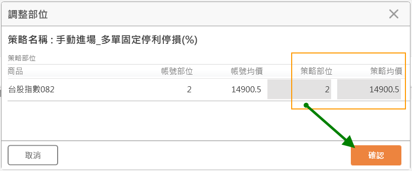 填入想要設定的部位跟均價之後,按下確定按鈕,策略就會重新執行這個商品。