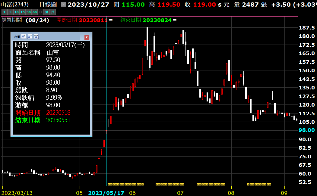 GetField("處置開始日期")、GetField("處置結束日期")這兩種資料在「資料欄位」與「選股欄位」都有建置,且所有腳本類型都有支援。 在7.12.01/3.12.01當中,新增了一個系統指標叫【處置期間】,根據這兩個欄位所建立。 可以在技術分析畫面上,點選右鍵→指標設定→新增主圖疊圖,查找系統/主圖指標/處置期間。
