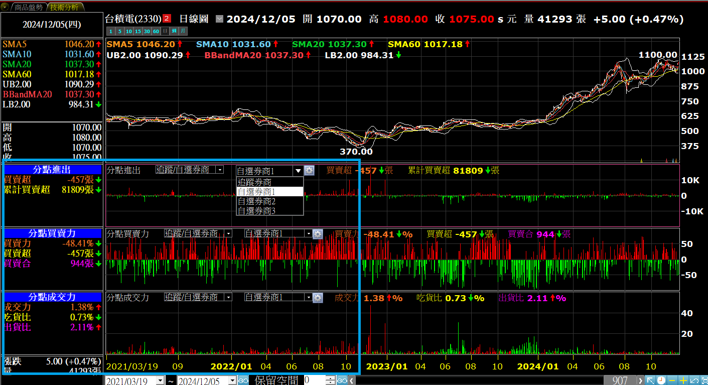 XQ 提供使用者可以自行選擇券商群組,追蹤"這群券商們”買賣什麼股票或是查看指標。 以下用 XQ 的技術分析指標設定案例來示範: 想要知道設定的這群券商們在台積電相關的買賣資料,可以加入分點指標(分點進出/買賣力/成交力),選擇「自選券商」來查看。若想了解更多細節,掌握 XQ 的 XS 指標腳本功能,可以參考 《 XS 編輯器:指標腳本撰寫教學 》。 ▼ 選擇「自選券商」來查看這群券商們在台積電商品中的指標分析