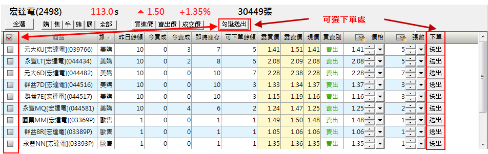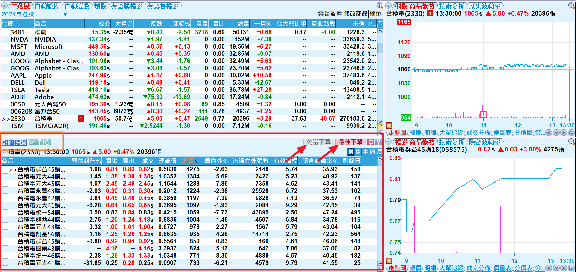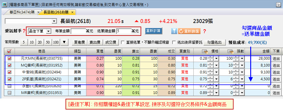 ▼在「相關權證區」右上角還有兩個下單按鈕,一為「勾選下單」,另一為「最佳下單」。先跟大家介紹XQ獨家提供的「最佳下單」功能。