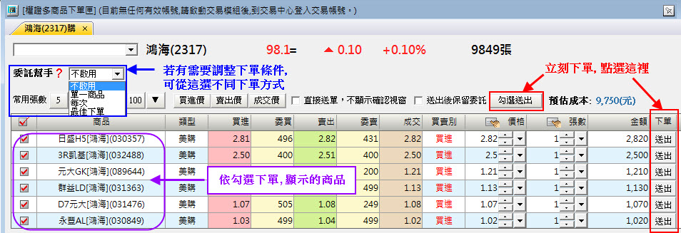 ▼在下單匣內,若您是要立刻下單,可點選「勾選送出」將下單匣內所有已勾選商品,一同送出下單;或是針對單一商品點選「送出」下單。若您還有需要調整價格、張數,您除了可從畫面上提供的價格、張數選擇進行調整外,還可以使用「委託幫手」再操作看看喔!