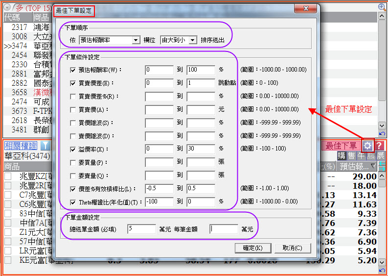 ▼「最佳下單設定」除了提供跟下單有關的權證進階篩選條件外,還提供下單金額設定及下單排序選擇功能。因這裡的下單排序方式與系統勾選商品次序有關,故大家在使用時,記得先確認您想依哪個下單條件,大到小or小到大排序喔!