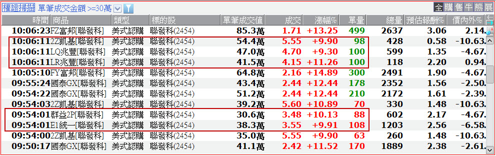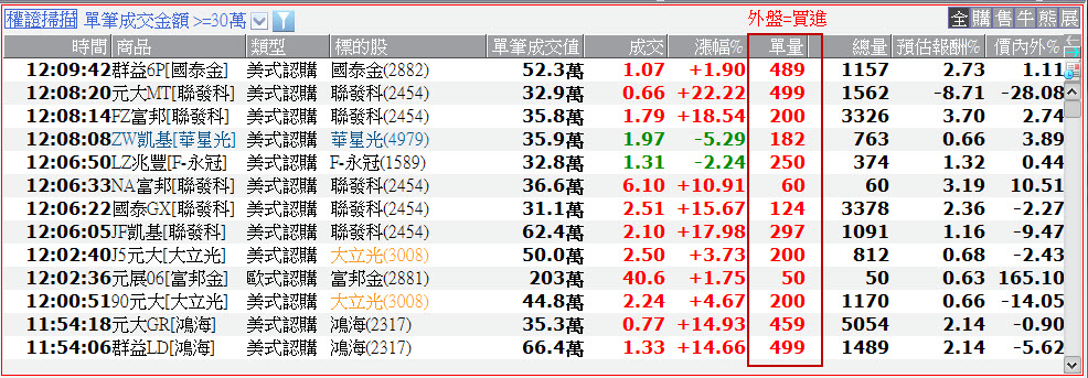 ▼若您想知道大戶對某檔股票的權證現在是買進還是賣出,就設單一標的股,這樣用起來就像查同標的明細進出,很快就能找到那些同秒掃貨or出貨的大戶交易了。