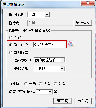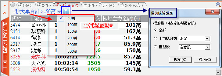 ▼【極短線主力進出】與【權證掃描】一樣有提供金額過濾及標的股篩選功能。