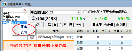 ▼看到標的股價格有異動,想下單,亦可由左側標的名稱右鍵,點選買進或是賣出。