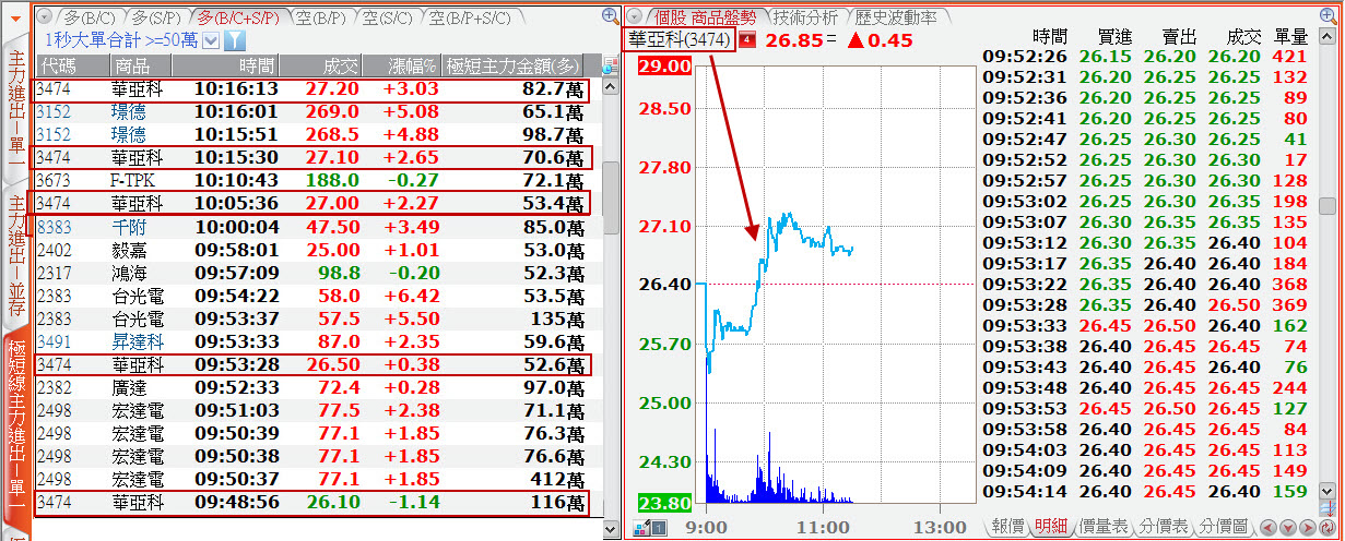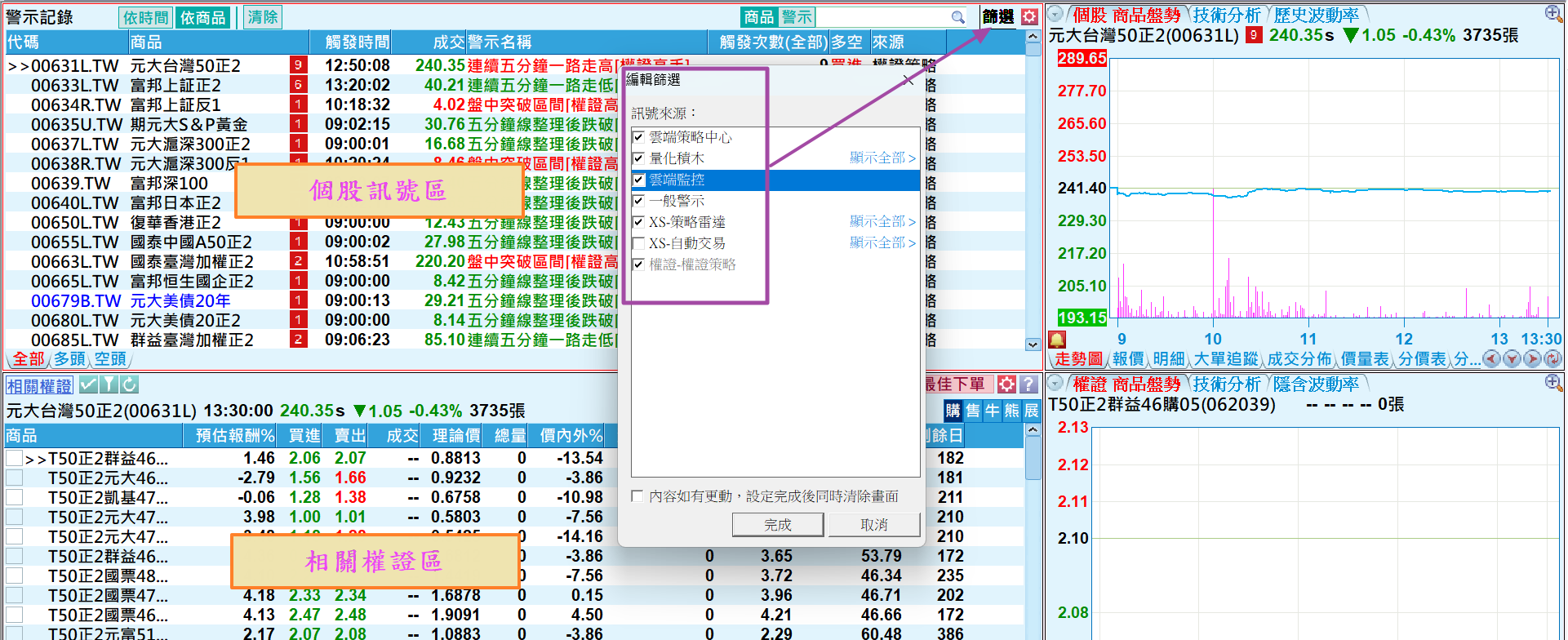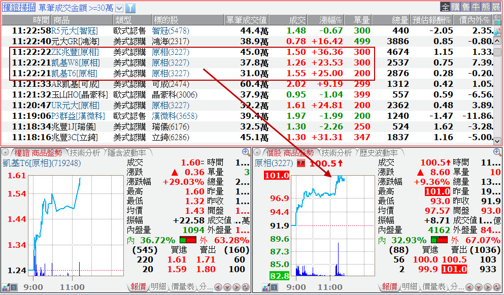 首先,觀察權證是否出現連續大單買進或賣出特定標的的趨勢,並判斷交易方向為買權或賣權。同時,檢視現股是否也隨之波動,從而決定是應該追蹤現股還是跟進權證操作,快速抓住市場脈動,緊跟賺錢機會。 ▼從權證掃描頁面中可同時觀察個股同時間是否有波動