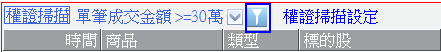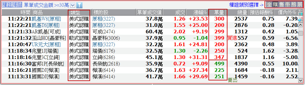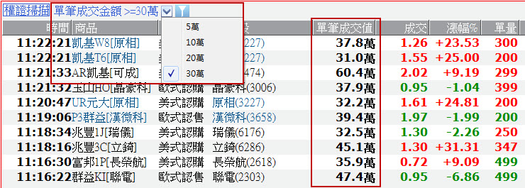 ▼【權證掃描】頁面左上方,有「單筆成交金額」過濾選項,我們可以選擇不同金額,查看一般大單or特別大單進出情形。