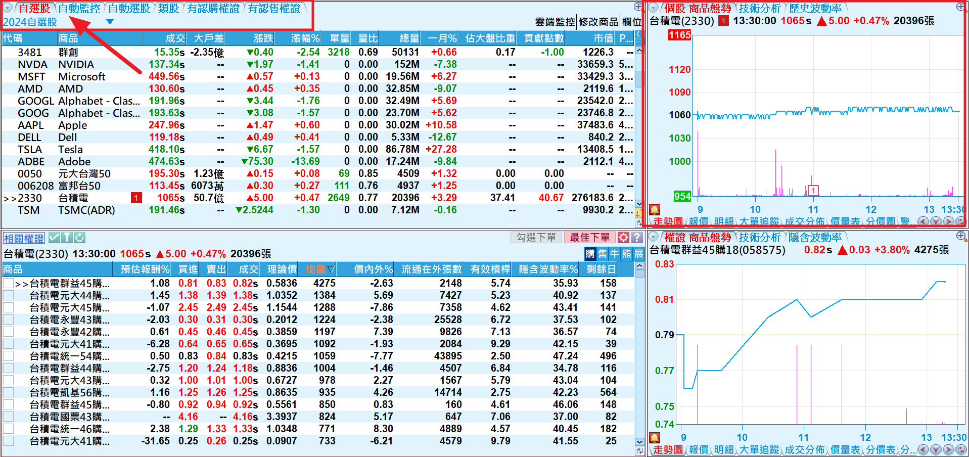 限定篩選出由自營分點(可能為避險單)操作的權證,集中觀察自營商的交易動態。可進一步瞭解自營商避險策略的資金分佈,協助判斷市場中的避險需求與價格波動壓力。 7. 權證看盤 盯緊口袋名單