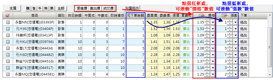 ▼下單匣,除提供投資人可由下拉選項,及即時報價區點選報價,改變各別價格外,亦提供統一改變所有價位快速鍵 (買進價/賣出價/成交價)。張數部分,亦可點選下拉選項,及可下單餘額進行更改。