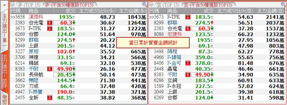 ▼【主力進出】,提供多空標的當日累計買賣金額統計。