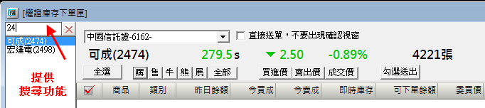 ▼當庫存標的太多時,可輸入關鍵字進行搜尋。