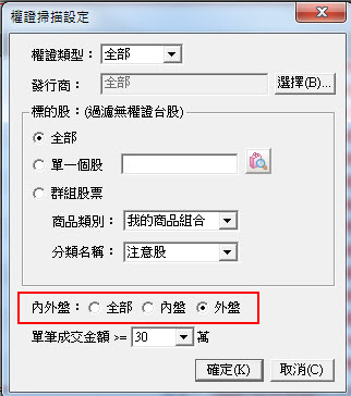 內外盤選項: 選擇「外盤」篩選追價買進成交情況,掌握大戶買進動向。 選擇「內盤」篩選賣出情況,捕捉大戶拋售的跡象。 單一標的股查詢: 指定特定標的進行權證明細進出分析,可快速定位大戶同時掃貨或拋貨的交易行為。 ▼設定畫面,畫面為選擇「外盤」