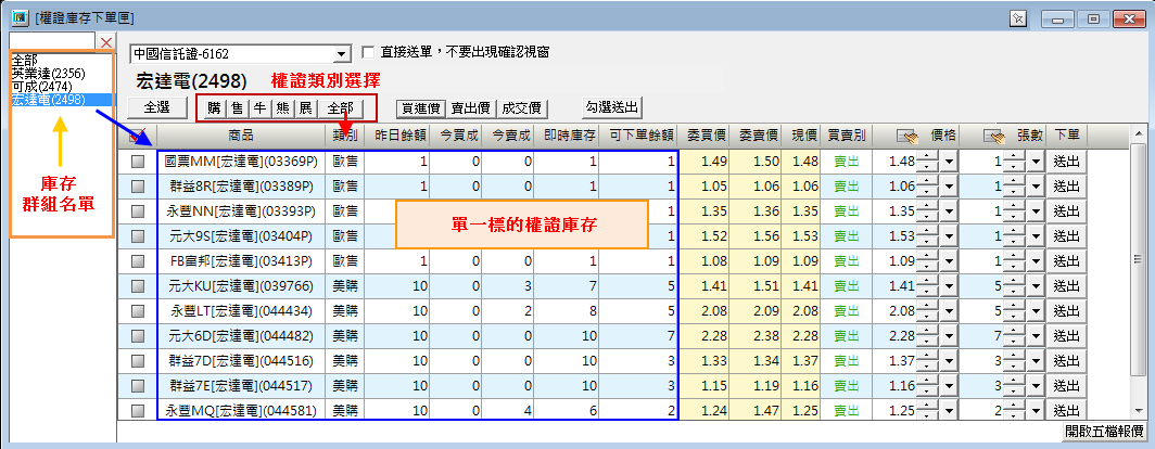 ▼權證庫存資料會依照標的股分類。左側列表,依標的股代碼排序顯示。右側庫存,依點選標的股及權證類型顯示。