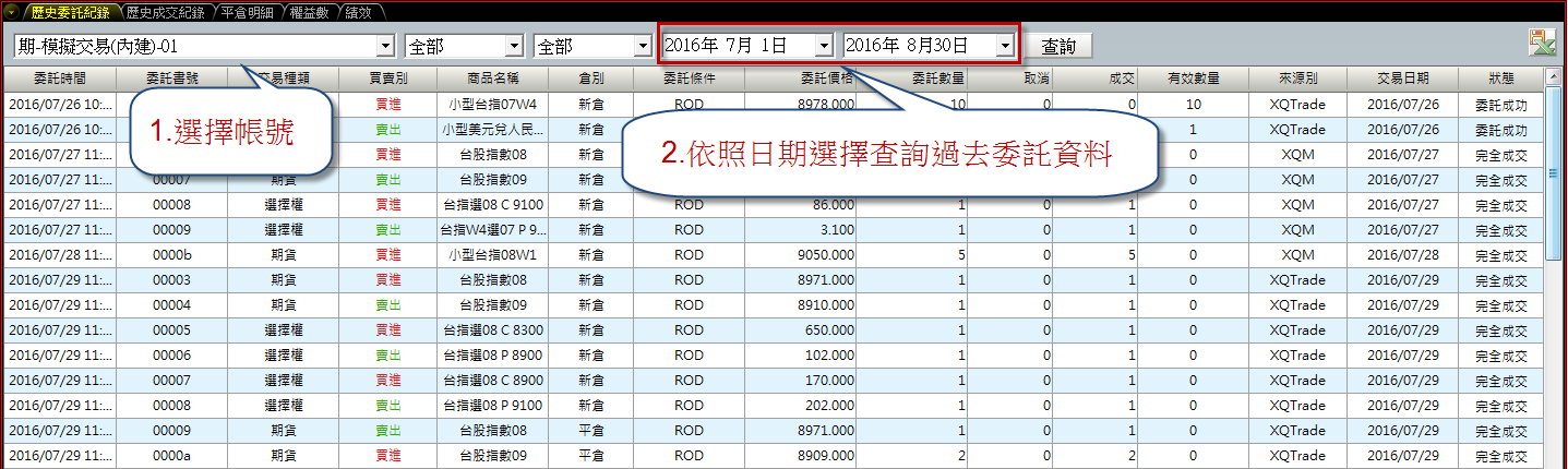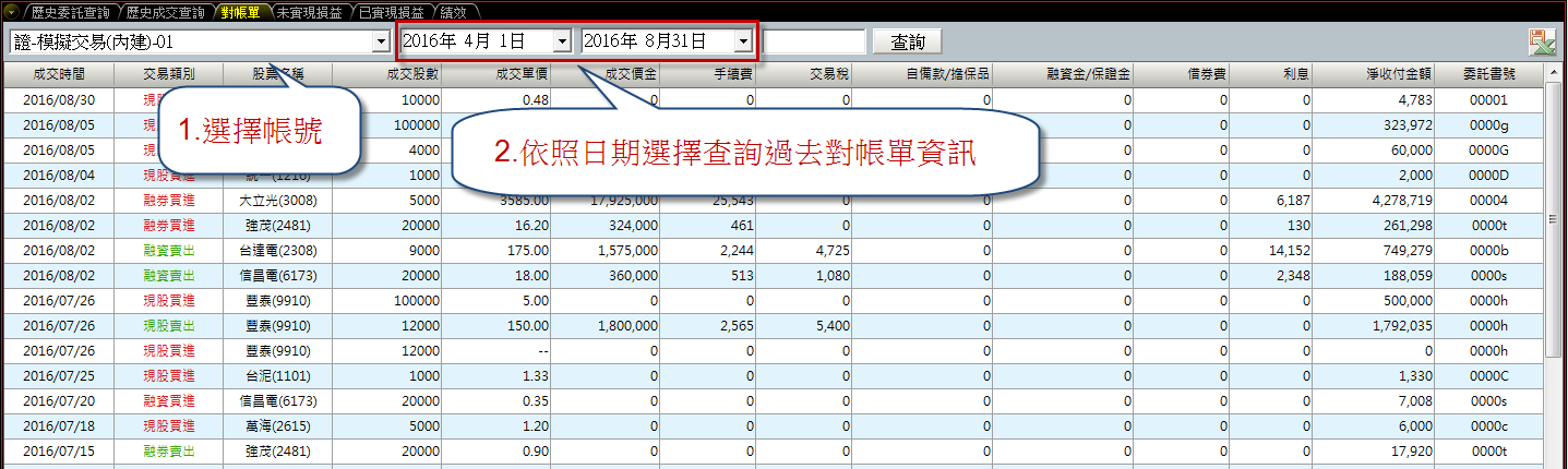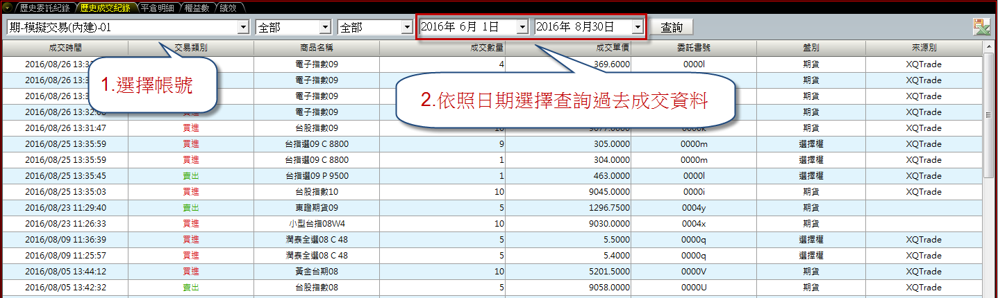 選擇欲查詢的帳號,再設定完查詢區間後,按下查詢,就會出現以前的成交明細。 選擇欲查詢的帳號,再設定完查詢區間後,按下查詢,就會出現以前的成交明細。