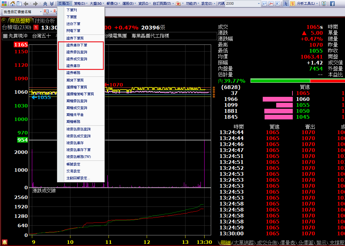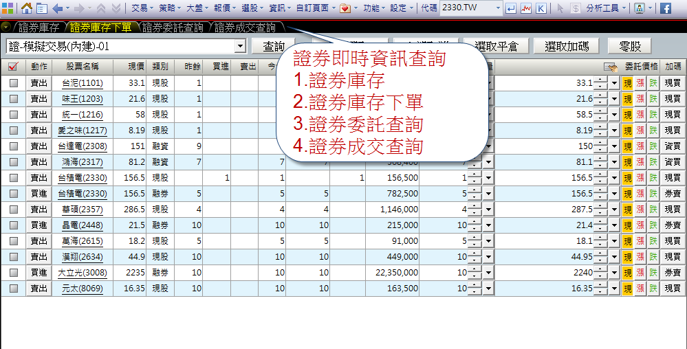 完成證券模擬交易下單後,可到交易目錄底下,查看即時的證券交易資訊,點選證券庫存下單、證券委託查詢、證券成交查詢、證券庫存四個選項之一,進入即時資訊查詢。 完成證券模擬交易下單後,可到交易目錄底下,查看即時的證券交易資訊,點選證券庫存下單、證券委託查詢、證券成交查詢、證券庫存四個選項之一,進入即時資訊查詢。證券即時交易資訊分為證券庫存下單、證券委託查詢、證券成交查詢、證券庫存等四項頁面,點選不同的頁面,會有不同的資訊,以下為四項頁面的說明: