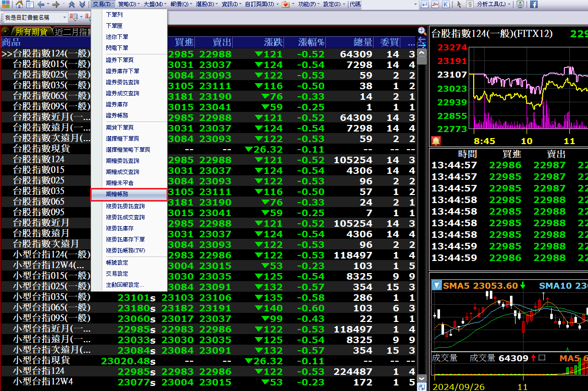 完成期貨模擬交易下單後,同樣到交易目錄下,點選期權委託查詢、期權成交查詢、期權未平倉三個選項之一,即可查看期貨即時交易資訊。 完成期貨模擬交易下單後,同樣到交易目錄下,點選期權委託查詢、期權成交查詢、期權未平倉三個選項之一,即可查看期貨即時交易資訊。期權即時交易資訊有期權未平倉、期權委託查詢、期權成交查詢等三項頁面,點選不同頁面,會有不同的資訊,請看以下說明: