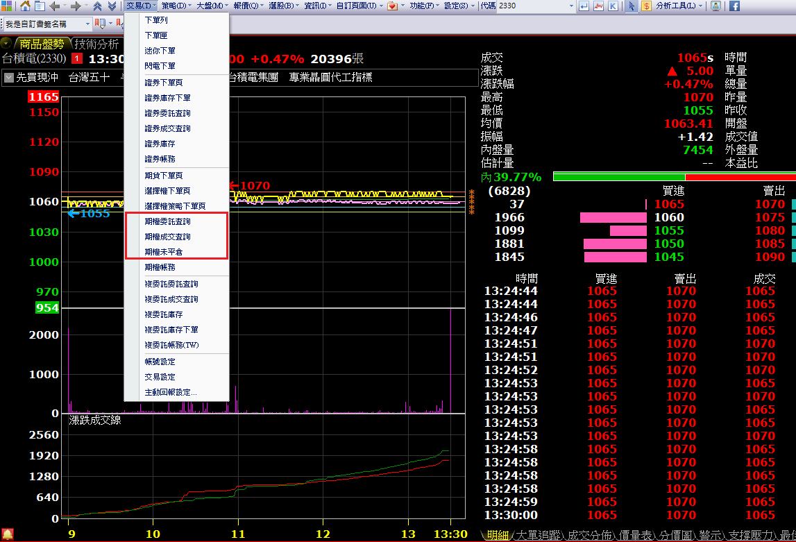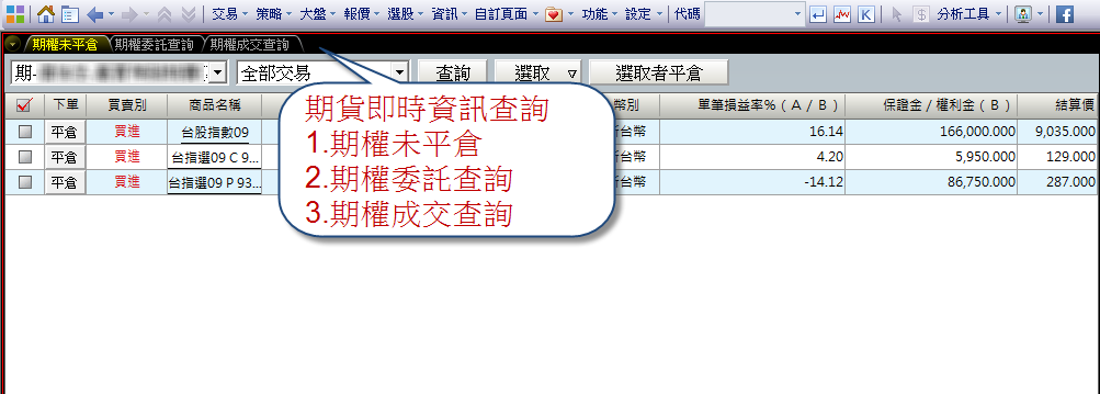 期權即時交易資訊有期權未平倉、期權委託查詢、期權成交查詢等三項頁面,點選不同頁面,會有不同的資訊 期權即時交易資訊有期權未平倉、期權委託查詢、期權成交查詢等三項頁面,點選不同頁面,會有不同的資訊