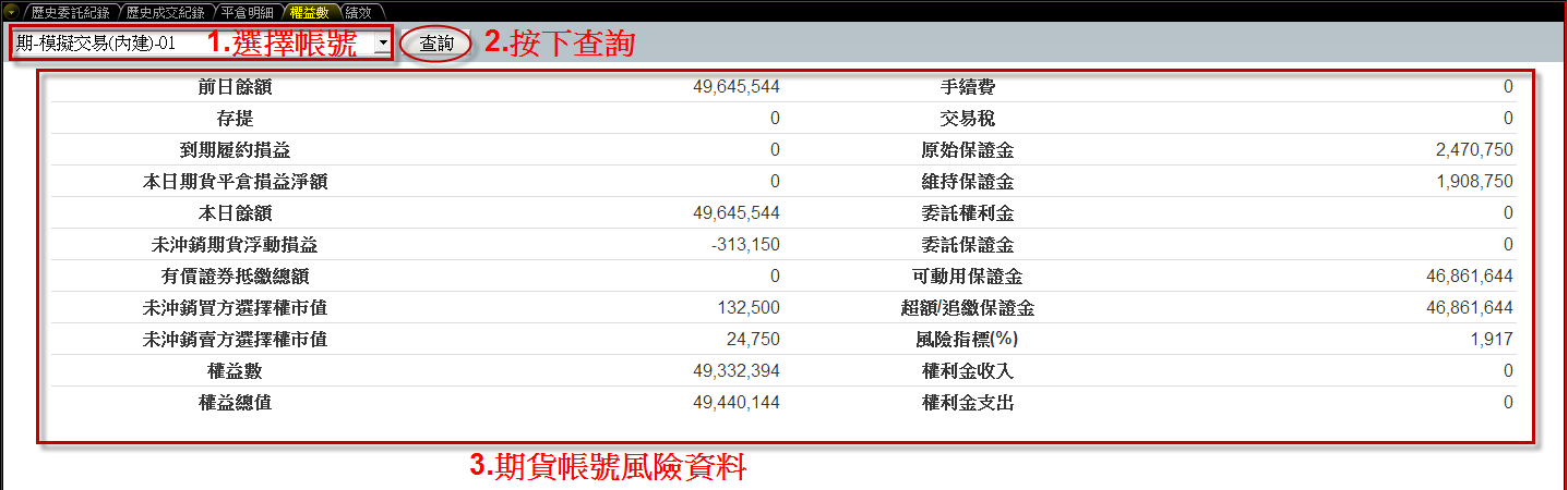 選擇欲查詢的帳號,此頁面會有每個帳號的期貨風險相關風險資訊。 選擇欲查詢的帳號,此頁面會有每個帳號的期貨風險相關風險資訊。